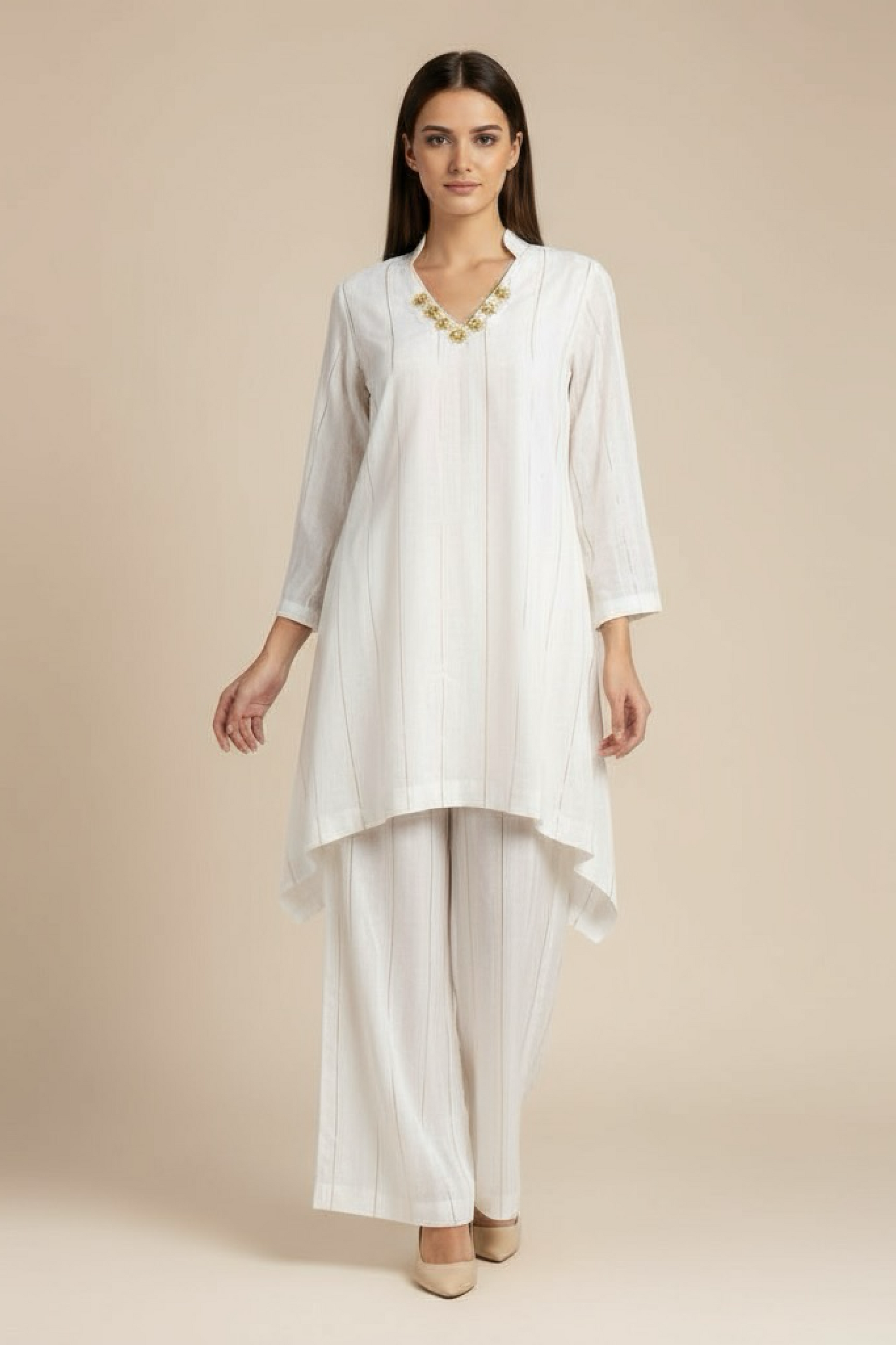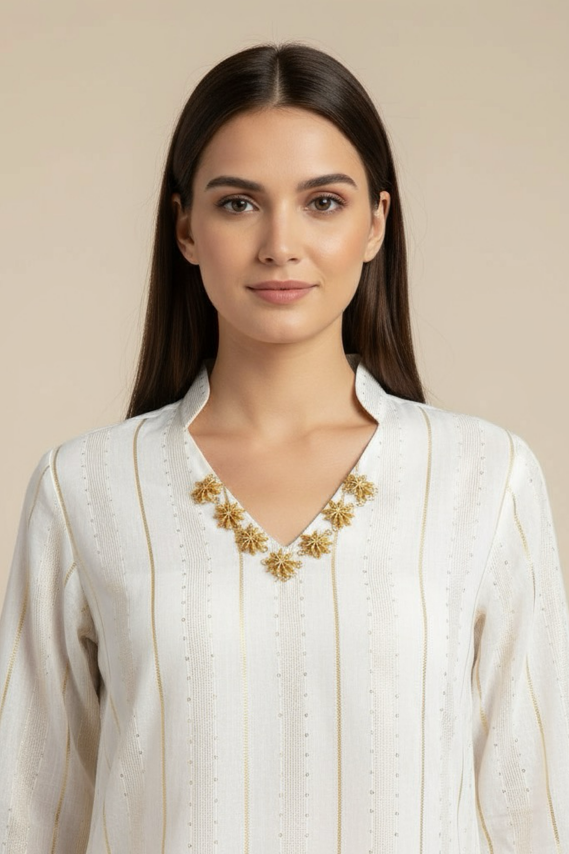 Inspired by the Indian spices .Made with pure cotton gold thread woven with micro sequins and embroidered with 22k Gold Star Anise 3D elements.