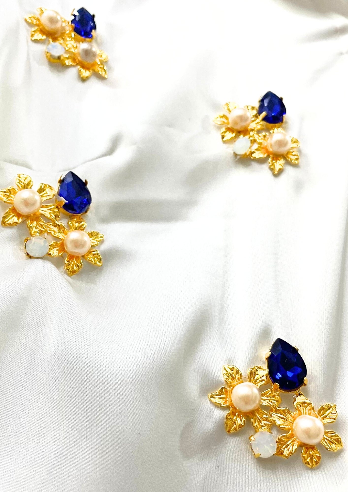 Made with satin base fabric and embroidered with 3D goldplated flowers , swarovski crystals and rose gold pearls .