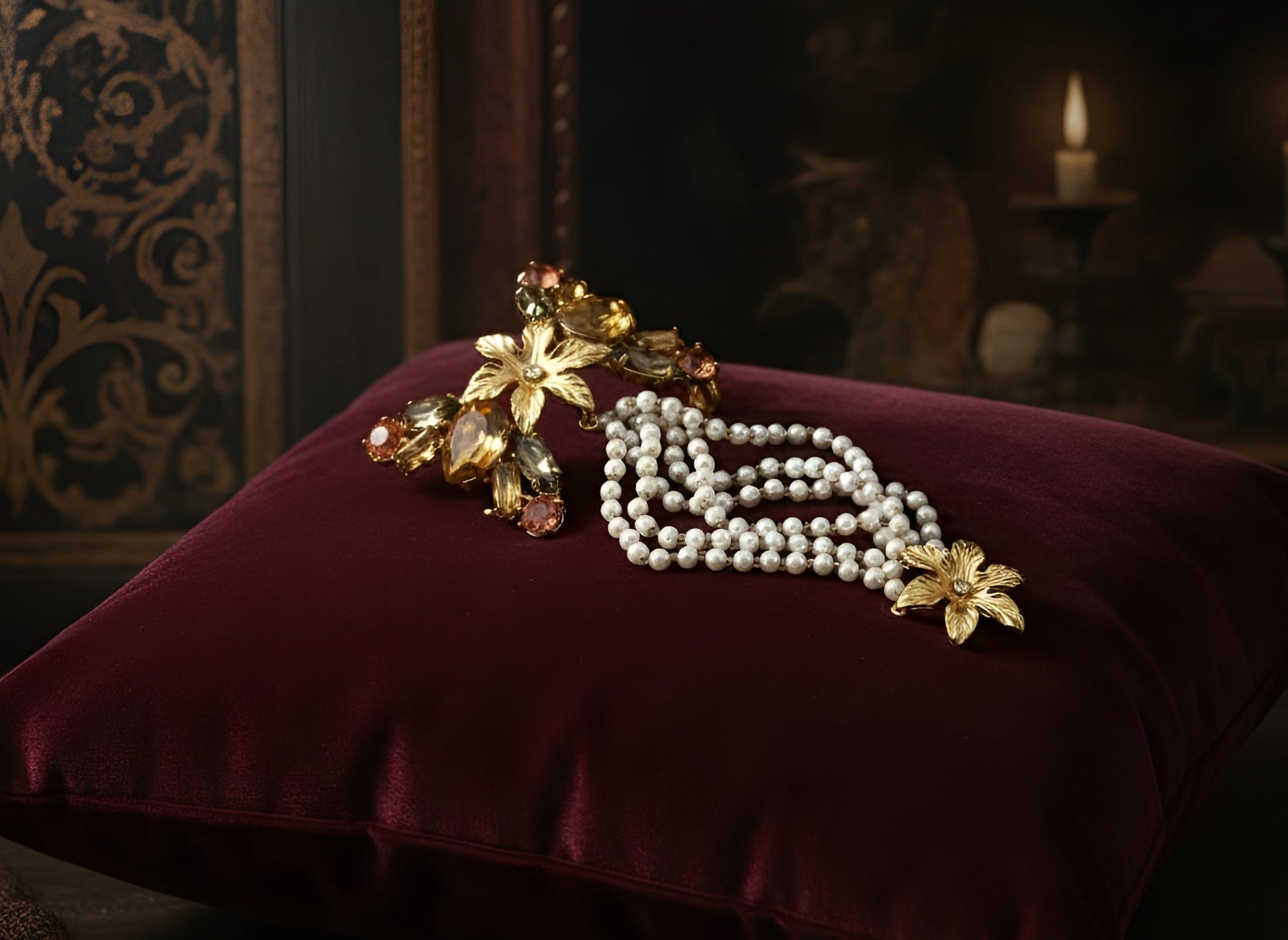 Delicate jasmin flower design crafted with intricate detailing, adorned with lustrous pearl accents. This traditional haath phool combines timeless elegance with graceful femininity, perfect for adding a touch of botanical beauty to your hand jewelry collection. The pearl piroi elements enhance the ethereal charm, making it an ideal choice for festive occasions, weddings, or everyday elegance.